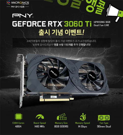 PNY 지포스 RTX 3060 Ti 출시를 기념하면서 이와 함께 사용할 수 있는 고성능 파워서플라이를 통해 최적의 경험을 제공하고자 기획된 이벤트는 소비자의 주목을 받으며 당초 준비한 제품 100개 모두 판매되었다. 이에 마이크로닉스는 더 많은 소비자가 최적의 경험을 할 수 있도록 앵콜 이벤트를 진행하기로 결정했다. 이전 이벤트와 마찬가지로 대상 그래픽카드는 ‘PNY GeForce RTX 3060 Ti 8GB UPRISING Dual Fan(LHR)’이다. 엔비디아 암페어(Ampere) 아키텍처가 적용된 지포스 RTX 3060 Ti(GA-104)는 4,864개 쿠다코어가 제공되어 안정적인 그래픽 가속 성능을 자랑한다.