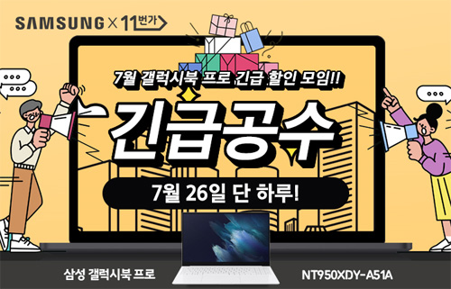 유니씨앤씨는 15.6인치 AMOLED 디스플레이 탑재와 초슬림 초경량 디자인으로 뛰어난 휴대성을 자랑하는 삼성 갤럭시북 프로 NT950XDY-A51A 모델을 대상으로 최대 39만원 추가 할인과 함께 푸짐한 사은품이 주어지는 ‘긴급공수’ 프로모션을 2021년 7월 26일 단 하루 동안 11번가를 통하여 단독 진행한다.