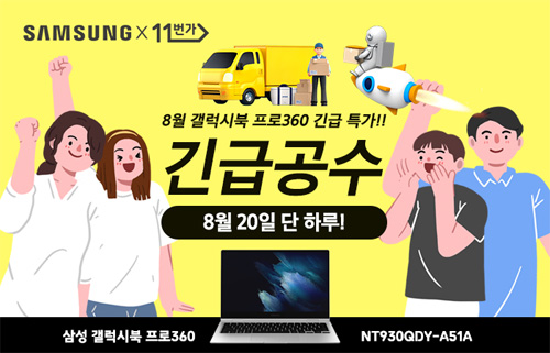 유니씨앤씨는 Super AMOLED 디스플레이와 최신 인텔 11세대 타이거레이크, 그립감이 뛰어난 S펜이 탑재된 삼성 갤럭시북 프로360 NT930QDY-A51A 대상으로 최대 35만원 추가 할인과 푸짐한 혜택이 주어지는 ‘긴급공수’ 프로모션을 2021년 8월 20일 단 하루 11번가를 통하여 단독 진행한다.