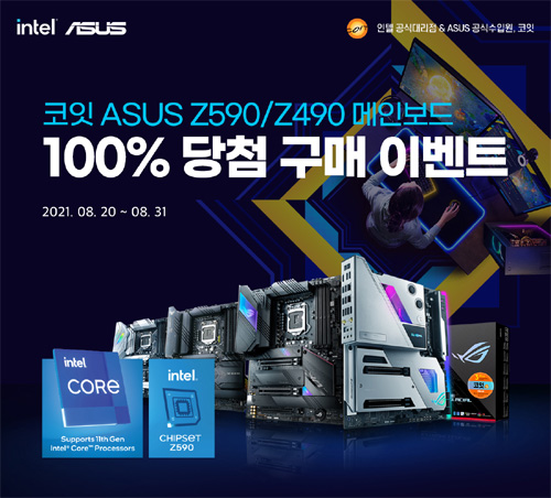 코잇은 ASUS Z590·Z490 메인보드를 구매 시 100% 당첨 스크래치 쿠폰을 증정하는 이벤트를 진행한다.