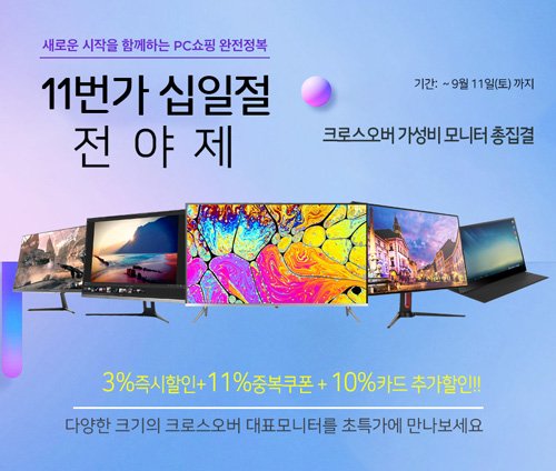 크로스오버는 자사의 인기 게이밍, 포터블 및 대화면 4K 모니터 20종을 대상으로 11번가 십일절 전야제를 진행한다고 밝혔다. 이번 행사 동안 크로스오버의 포터블, 27, 32, 40형, 고해상도, 고Hz, 평면, 커브드, 게이밍 등 다양한 모니터들이 저렴하게 판매된다.