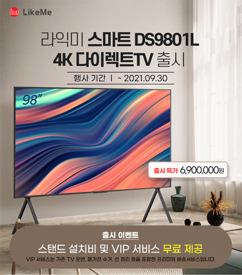 라익미는 ‘스마트 DS9801L HDR 다이렉트 TV’의 출시를 기념해 출시 이벤트를 진행한다. 6,900,000의 출시 특가 이벤트와 함께 무상 스탠드 설치와 기존 TV 운반, 폐가전 수거, 선 정리를 포함하는 프리미엄 배송 서비스인 VIP 서비스를 무료 제공한다. 출시 이벤트에 관한 자세한 정보는 라익미 공식 판매처, 오픈마켓, 상세페이지 등을 통해 확인할 수 있다.