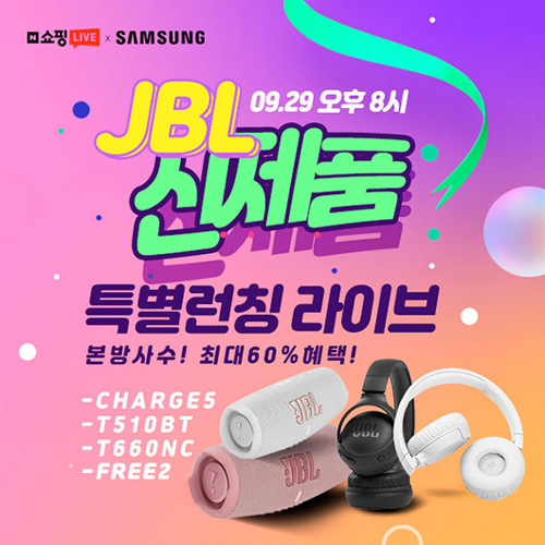 라이브 방송에서는 빵빵하고 시원한 아웃도어 사운드를 들려주는 JBL CHARGE5 블루투스 스피커와 가볍고 편안한 착용감이 장점인 T510BT 블루투스 헤드셋, 액티브 노이즈 캔슬링을 지원하는 T660NC 블루투스 헤드셋, 생동감 넘치는 시그니처 사운드를 제공하는 JBL FREE2 블루투스 이어폰을 선보인다. 라이브 방송 중 구매 시, 정가 대비 최대 60% 할인 혜택이 제공된다.