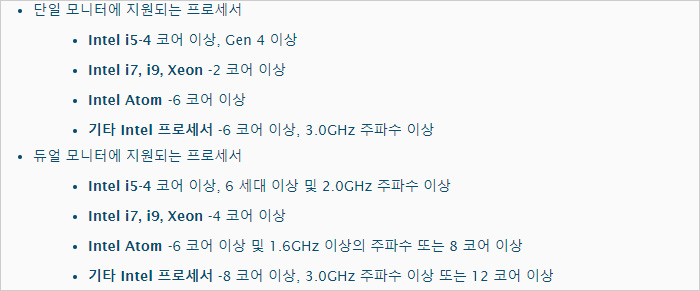 49개 축소판 활성화를 위한 최소 사양의 모습으로 아주 높은 스펙을 요구하는 것은 아니지만 펜티엄이나 i3 와 같은 보급형 프로세서는 권장하지 않는 것을 확인할 수 있다.