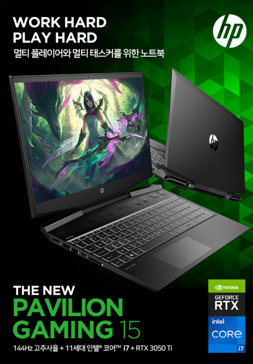 ‘HP 파빌리온 게이밍 15 dk2088TX’는 인텔 11세대 코어 i7-11370H와 암호화폐 채굴 이슈로 인하여 금값이 되어버린 그래픽 카드 시장 속 차세대 고성능 그래픽카드로 주목받는 엔비디아 지포스 RTX™ 3050Ti(4GB GDDR6)가 탑재되어 게이밍 노트북 시장의 새로운 가성비 제품으로 떠오르고 있다. NVIDIA 의 2세대 RTX 아키텍처인 암페어(Ampere) 기반의 RTX 3050 Ti 그래픽은 이전 세대 대비 40% 향상된 성능은 물론, 실시간 레이 트레이싱과 AI 성능으로 영화와 같은 그래픽 품질의 최신 게임을 완벽하게 즐길 수 있다. 15.6형 FHD 대화면 디스플레이는 144Hz 고주사율을(1초당 이미지 전환 수) 지원해 60Hz를 지원하는 일반 디스플레이보다 2배 이상의 부드러운 프레임에서 게임 플레이가 가능하다. 72% NTSC 색재현율은 풍부한 색감을 보여주며 IPS 광시야각 패널 탑재로 어디서나 밝고 선명한 영상을 즐길 수 있다. 7mm의 Micro Edge베젤로 게임 플레이시 몰입감 있는 화면을 즐길 수 있는 것도 특징이다.