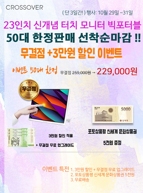 크로스오버는 23형 화면에 FHD 해상도를 적용한 모니터 ‘230FL75 IPSTYPE-C 터치 HDR 빅포터블’을 대상으로 단 3일간만 특별 이벤트를 실시한다.