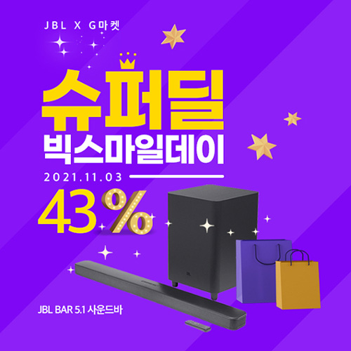 유니씨앤씨는 빅스마일데이를 맞이하여 TV 사운드 퀄리티를 한 층 업그레이드 시켜주는 JBL BAR 5.1 사운드바를 대상으로 정가 대비 43% 할인 혜택이 제공되는 ‘슈퍼딜’ 프로모션을 G마켓을 통해 2021년 11월 3일에 진행한다.