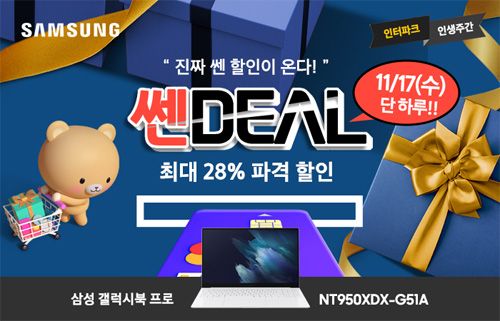 유니씨앤씨는 대화면 AMOLED 디스플레이와 지포스 외장그래픽이 탑재된 삼성 갤럭시북 프로 NT950XDX-G51A 모델을 대상으로 최대 44만원 중복 할인과 함께 푸짐한 혜택이 주어지는 ‘쎈딜’ 프로모션을 2021년 11월 17일 단 하루 동안 인터파크를 통하여 단독 진행한다.