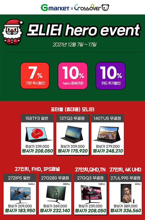 이번 행사 동안 크로스오버의 포터블, 27형, 32형등 다양한 모니터들이 저렴하게 판매된다. 행사 기간동안 해당 상품들에 7% 즉시할인, 10% 히어로 중복쿠폰을 내려받아 특별 할인가에 구입 가능하다. 여기에 10% 카드 추가 할인(KB, 롯데, 삼성카드) 까지 지원해 할인폭은 더더욱 높아진다. 행사기간은 12월 7일 화요일부터 17일 금요일까지총 10일간 펼쳐지며 행사기간 동안 판매되는 제품들은 전부 무료배송으로 발송된다.