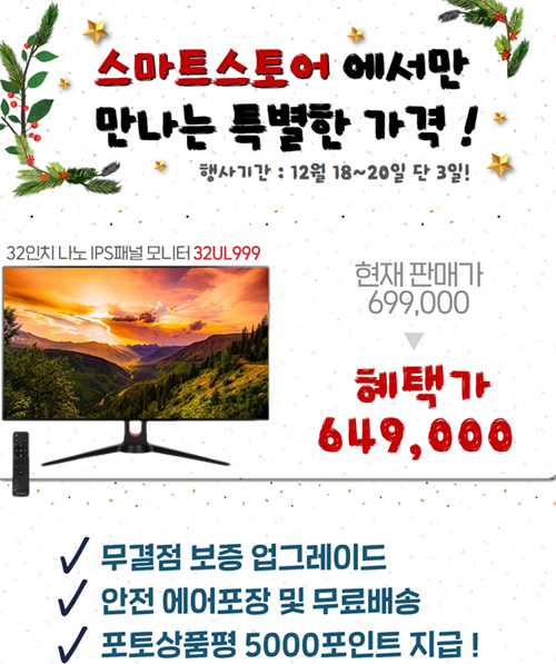 먼저 12월 18일(토)부터 20일(일)까지 선착순 50대 한정으로 진행되는 32UL999 DCI-P3 98 TYPE-C 4K PREMIUM 멀티스탠드행사는 699,000원에 판매되는 무결점 모델을 기존보다 5만원 할인된 649,000원에 특가 판매되며, 특전 사은품으로 무료배송과 외부 충격 방지를 위해 고급 에어포장을 실시해 배송한다. 또한 포토상품평 작성시 네이버 포인트 5,000원을즉시 지급한다.