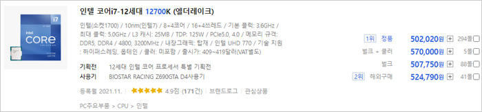 12세대 인텔코어 프로세서 i7-12700K 의 가격을 확인하고 있는 모습으로 정품과 비정품간 가격차가 거의 없는 것을 확인할 수 있다. (오히려 정품이 더 저렴하다.) 아마존 직구의 경우 50만원을 훌쩍 넘어가며 뉴에그 직구의 경우 405달러 (48만원) 이지만 배송와 세금등을 계산하면 정품보다 가격이 올라간다. 굳이 비정품 CPU를 구입할 필요가 없다. 가격적인 매리트를 주지 못하기 때문이다.