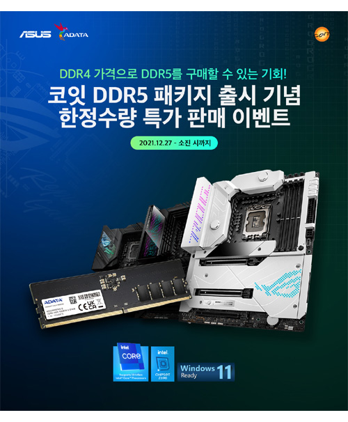 코잇은 차세대 DDR5 메모리 출시에 따라 DDR5 지원 ASUS 메인보드와 ADATA DDR5 메모리 패키지를 특가로 판매한다.