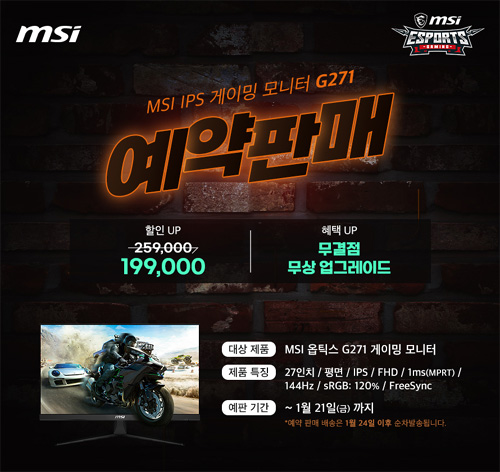 행사 대상 제품 중에서 주목할만한 제품은 ‘MSI 옵틱스 G271’이 있다. 144Hz 주사율, 1ms MPRT 응답속도를 실현한 27형 FHD(1920*1080) IPS 패널로 게임 환경뿐만 아니라 일상 영역에서도 충분한 성능을 제공한다. 국내 게이밍 모니터 시장에서 소비자의 많은 사랑을 받아 온 ‘MSI 옵틱스 G271’은 1월 21일까지 예약 판매가 진행되는 가운데, 종전 판매가 대비 약 20% 할인된 19만 원대 최종 구매가와 무결점 무상 업그레이드 혜택이 제공된다.
