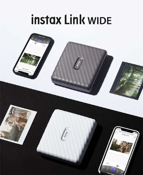 이번에 출시한 인스탁스 링크 와이드는 컴팩트한 디자인과 함께 핸드 스트랩과 스탠드가 포함되어 간편하게 어디서나 들고 다닐 수 있는 것이 장점이다. 스마트폰에서 사진을 선택하고 편집한 후에 간단하게 인쇄만 하면 된다. 색상은 애쉬 화이트, 모카 크레이 총 2종으로 출시됐으며, 가격은 21만 원이다. 필름 사이즈는 86mmx108mm이며, 화질은 800×1260화소로 기존의 인쇄 퀄리티에서 ‘instax-Rich 모드’가 추가돼 색상이 더욱 풍부해진 것이 특징이다.