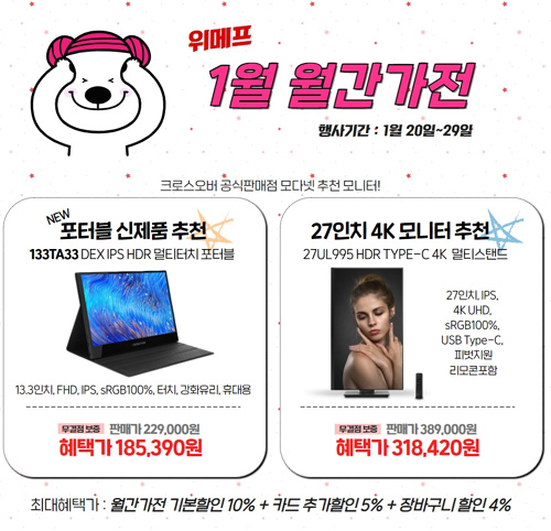 크로스오버는 자사의 인기 게이밍 모니터 22종을 대상으로 위메프 1월 월간가전 특가전을 실시한다고 밝혔다.