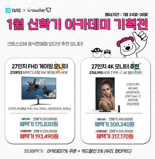 크로스오버는 자사의 인기 포터블, 고해상도, 게이밍 모니터 19종을 대상으로 오늘의 집 1월 아카데미 이벤트를 펼친다고 밝혔다.