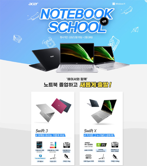에이서가 졸업과 입학 시즌을 맞이하여 롯데하이마트와 함께 노트북 할인 행사 ‘노트북 투 스쿨’ 프로모션을 진행한다고 16일 밝혔다.