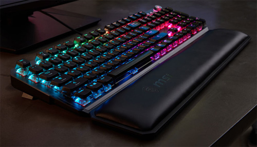 ‘MSI GK71 소닉 게이밍 키보드’는 더 가벼운 타건감과 빠른 응답속도를 위해 MSI에서 자체적으로 개발한 MSI 소닉 스위치 적축을 탑재하여 더 적은 움직임을 통해 더욱 빠른 반응속도로 정확하고 수준 높은 게이밍 환경을 제공한다. 또한 게이밍 중 키 입력에 대한 충돌이 없도록 동시 입력이 가능한 안티 고스팅 기능과 RGB LED 및 멀티미디어 제어 키와 함께 음소거 및 음량 조절이 손 쉽게 가능한 휠 방식의 키가 탑재되어 더욱 편리한 게이밍이 가능하다.