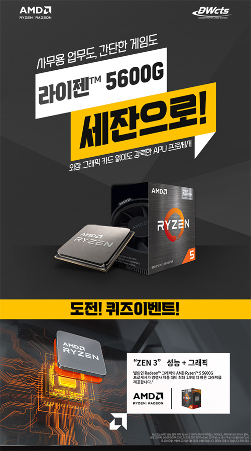 대원CTS는 AMD CPU 세일즈팀과 함께 라이젠 5600G 세잔 퀴즈 이벤트를 진행한다고 밝혔다.