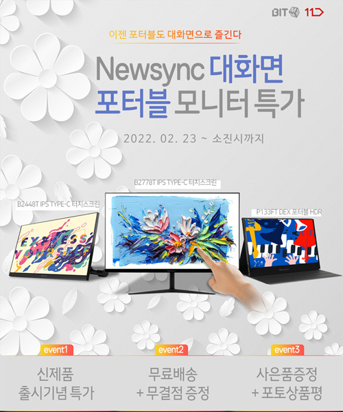 이번 기획전에서 선보이는 신제품은 24형 대화면 포터블 모니터인 ‘B2448T IPS TYPE-C 터치스크린’과 27형 대화면 포터블모니터 ‘B2778T IPS TYPE-C 터치스크린’, 그리고 13.3형 휴대용 포터블 모니터인 ‘P133FT DEX 포터블 HDR’ 등 총 3종이다.