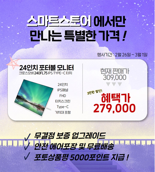 240FL75 IPS TYPE-C 터치 HDR 빅포터블은 베스트셀러를기록한 크로스오버 230FL75의 후속으로 기존 포터블 모니터가 15인치 정도 크기를 가진데 반해 화면을 24인치로 늘려 보는 맛을 키운 점이 특징이다. 타입C, HDMI 단자를 달아 다양한 기기와 연결 가능하고덱스에 무선 키보드 마우스를 연결해 조작성이 한층 더 좋아졌다.