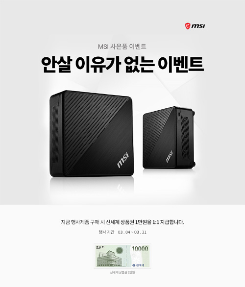 MSI 미니 CUBI 5 사은품 이벤트는 2022년 3월 4일부터 31일까지 컴퓨존에서 진행하며, 구매금액이나 개수와 상관없이 행사제품을 구매한 모든 고객에게 신세계상품권 1만원권을 1:1 방식으로 지급하고 있다.