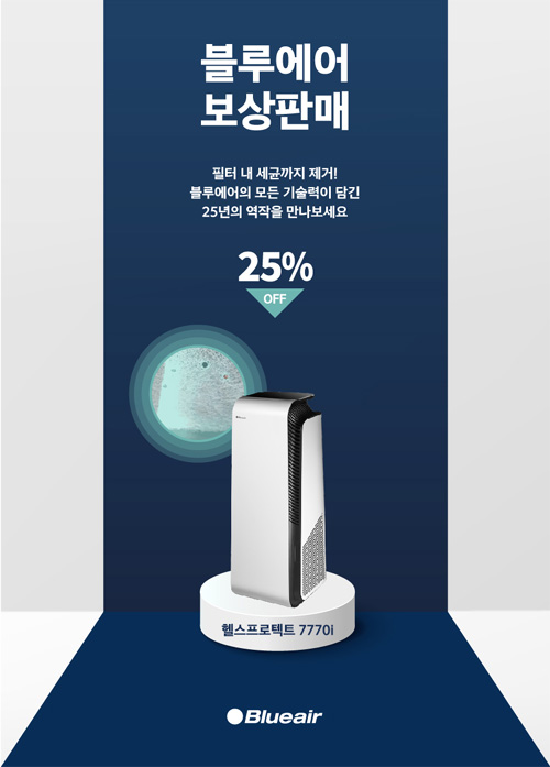 이번 프로모션은 ‘Blueair is Back, Blueair로 Back’으로 25년동안 공기청정기만 연구한 블루에어의 모든 기술력이 담겨있는 헬스프로텍트 7770i로 업그레이드 할 수 있는 기회를 제공하기 위해 기획됐다. 이 제품은 다양한 바이러스와 박테리아가 기승하는 환경에 대응하기 위해 공간의 공기뿐만 아니라 필터 내부에 존재하는 오염물질까지 케어하는 것이 특징이다 .