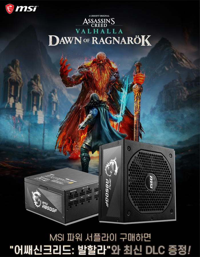 MSI는 ‘MSI A850GF 80 PLUS GOLD’ 파워 서플라이 구매 고객을 대상으로 최신 게임 ‘어쌔신크리드 발할라' 본편 및 '라그나로크의 서막’ DLC 게임코드를 포함, 최대 13만 원 상당의 혜택을 증정하는 이벤트를 진행한다