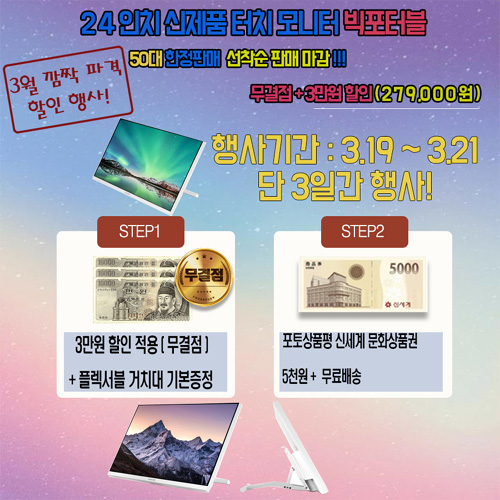 이번 행사동안 크로스오버의 빅포터블, 24, 27,32형 등 다양한 모니터들이 저렴하게 판매된다. 행사기간은 3월 19일 토요일부터 21일 월요일까지 진행되며 다양한 제품들을 저렴한 가격에 만나볼 수 있다. 포토상품평 이벤트도 진행돼 간단하게 상품평을 작성하고 상품권도 받아갈 수 있다.