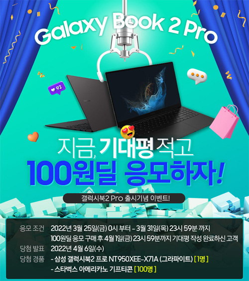 갤럭시북2 100원딜 이벤트는 행사기간 내 100원으로 이벤트 제품구매 후 4월 1일까지 기대평을 작성하면 응모가 완료되고, 4월 6일 추첨을 통해 삼성의 최신형 모델인 ‘갤럭시북2 프로’ 노트북과 스타벅스 아메리카노 기프티콘을 선정해 증정한다.