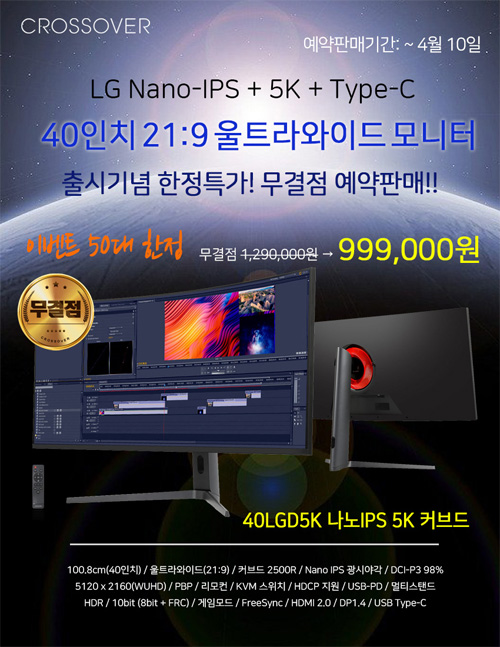 크로스오버가 40형 5K 초고해상도 커브드 모니터 ‘40LGD5K 나노IPS5K 커브드’ 출시를 기념하기 위해 무결점 예약판매 특가 이벤트를 진행한다고 밝혔다.