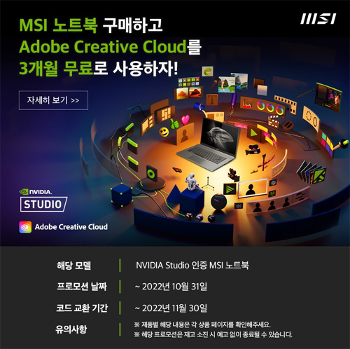 이번 프로모션은 2022년 10월 31일(월)까지 기간 한정으로 진행된다. 해당 기간 안에 엔비디아 스튜디오 인증을 받은 MSI 크리에이터 Z16 노트북을 구매하면, 포토샵, 프리미어 프로 등 20개 이상의 어도비 소프트웨어와 더불어 수천 개의 글꼴을 3개월 간 무료로 사용 가능하다. 해당 프로모션은 재고 소진 시 예고 없이 종료될 수 있다.