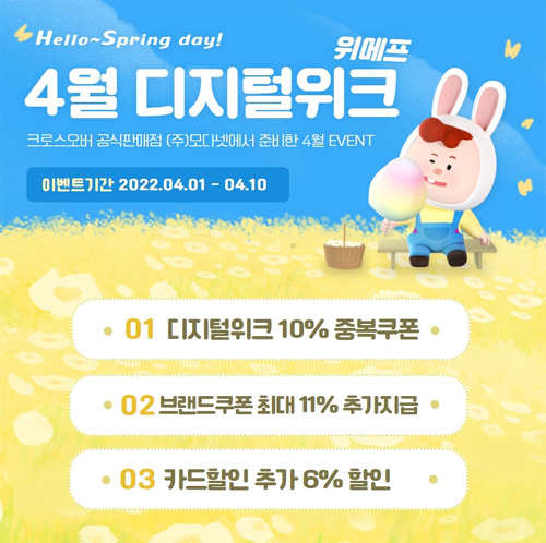 행사기간은 4월 1일 금요일부터 4월 10일일요일까지 진행되며 행사기간 내에 배송비는 전부 무료다. 행사 기간 동안 기본할인 10%, 카드 추가할인 6%, 브랜드쿠폰 11% 등 다양한 혜택이 제공된다. 자세한 행사 상품 및 가격은 아래와 같다.