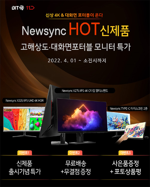 4월 7일부터 소진시까지 11번가 단독으로 진행되는 이번 초특가 행사기간 동안 Newsync X27U IPS 4K C타입 멀티스탠드는 초특가 332,100 원 + 무결점 무료 Upgrade / Newsync X32U IPS UHD 4KHDR은 초특가 332,100원 + 무결점 무료 Upgrade / B2778T IPS TYPE-C 터치스크린은 초특가 332,100원 + 무결점 무료 Upgrade / B2448T IPS TYPE-C 터치스크린은 초특가 251,100원 + 무결점 무료 Upgrade로 진행된다.