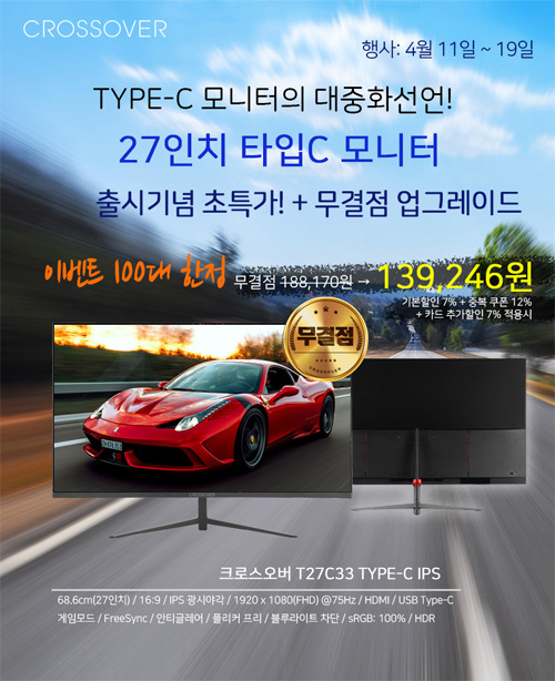 크로스오버가 27형 USB TYPE-C 모니터 ‘T27C33 TYPE-C IPS’ 출시기념 무결점 무료 업그레이드 및 특가 이벤트를 진행한다고 밝혔다.