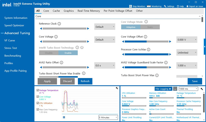 인텔 XTU는 배수와 버스클럭, 전압 등을 세밀하게 조정할 수 있다. 사용자가 원하는 값을 통해 PC환경내에서 최상의 값을 만들 수 있는 것이 장점이라 할 수 있다. 특히 오버클럭에 문제가 없는 것을 확인할 수 있도록 스트레스 테스트도 지원하며 벤치마크를 통해 오버클럭 후의 성능도 확인할 수 있다.