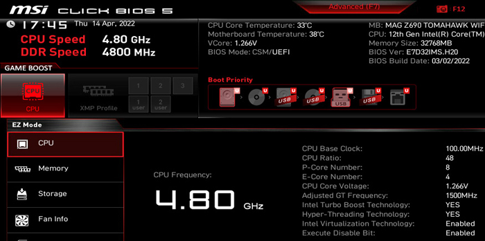 손쉽게 오버클럭 할 수 있는 방법도 다양하게 제공된다. 우선 메인보드 제조사에서 원터치 오버클럭 기능을 지원할 경우 버튼 한번만 눌러주면 자동으로 오버클럭이 진행된다. 테스트에 사용된 MSI Z690 메인보드의 경우 GAME BOOST 라는 원터치 오버클럭을 지원해 초보자도 쉽게 오버클럭 할 수 있다.
