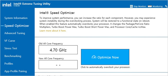 마지막으로 말씀드릴 방법은 인텔 XTU에 있는 SPEED 옵티마이저를 사용하는 것이다. 기존의 XTU는 하이엔드 유저들을 위하 수동 오버클럭 방법만을 제공했는데 K프로세서를 사용하는 유저들이 늘어나면서 쉽게 오버클럭 할 수 있도록 스피드 옵티마이저를 추가했다.
