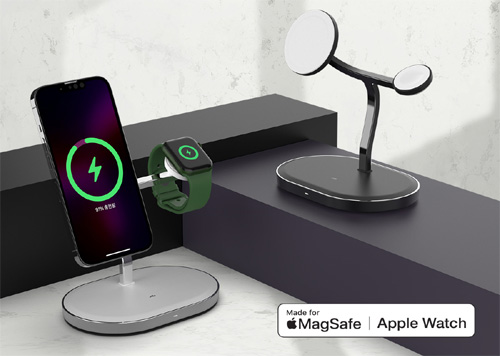 애플 공식 인증(MFM)을 받은 맥세이프 3in1 무선 충전기는 최대 15W의 안전한 무선 충전 기능을 제공한다. 최신 iPhone 12 모델부터 도입된 맥세이프 기술을 활용한 것이 특징이다. 자석식 무선충전 모듈 맥세이프(MagSafe)방식을 통해 아이폰을 간단히 탈부착 및 고속 무선충전하며, 최신 애플워치, 에어팟을 동시에 빠르고 효율적으로 충전할 수 있다.