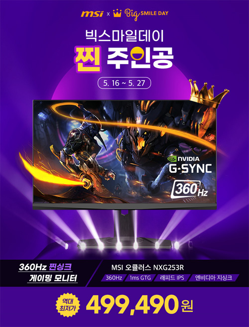 MSI는 국내 유명 오픈 마켓, 옥션과 G마켓에서 열리는 ‘빅스마일 데이’ 행사에 MSI 게이밍 모니터의 참여 소식을 전했다. 5월 최대의 쇼핑 기획전이 될 ‘빅스마일 데이’ 행사는 2022년 5월 16일부터 27일까지 옥션과 G마켓에서 열리며, 15% 선택 쿠폰과 5% 카드 할인 혜택을 제공한다. MSI는 쇼핑몰 기본 제공 혜택 외에 일부 제품에 추가 할인을 적용, 5월의 축제를 더욱 빛낼 계획이다.