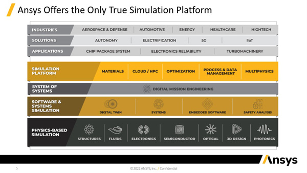 앤시스는 또한 업계에서 가장 광범위한 포트폴리오를 통해 물리적 장치에서부터 시스템, 플랫폼까지 검증할 수 있는 폭넓은 시뮬레이션 솔루션을 제공함으로써 항공우주, 자동차, 방산, 에너지, 산업장비, 헬스케어, 하이테크 및 소비재 등 다양한 산업군의 고객 기업의 요구 사항을 충족시키고 있으며, 자율주행, 전기화(Electrification), 5G/6G, IIoT와 같은 혁신 기술의 개발도 이끌어가고 있다.