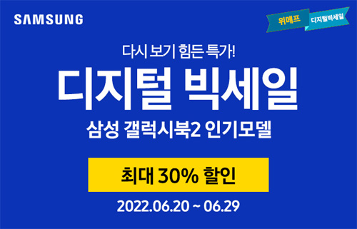 유니씨앤씨는 다가오는 2022 여름방학을 맞아 고화질 AMOLED 디스플레이와 초슬림, 초경량으로 뛰어난 휴대성을 자랑하는 삼성 갤럭시북2 프로 / 프로360 / 갤럭시북 프로360을 대상으로 최대 44만원 중복 할인과 푸짐한 사은품이 증정되는 ‘디지털 빅세일’ 프로모션을 2022년 6월 20일부터 6월 29일까지 위메프를 통하여 단독 진행한다.