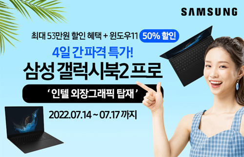 유니씨앤씨는 최신 인텔 12세대 CPU와 인텔 아크 그래픽 탑재, 초슬림 초경량 디자인으로 뛰어난 휴대성을 자랑하는 삼성 갤럭시북2 프로 NT950XEV-G51A 모델을 대상으로 최대 53만원 할인 혜택이 주어지는 ‘여름휴가 특가’ 프로모션을 2022년 7월 14일부터 7월 17일까지 네이버 스마트스토어를 통하여 단독 진행한다.