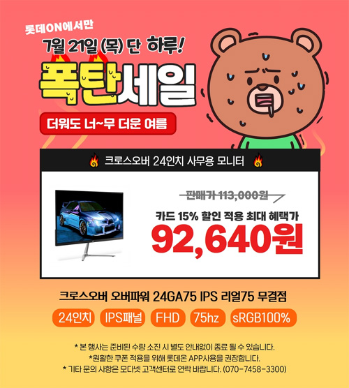 롯데온에서 7월 21일(목) 단 하룻동안 진행되는 이번 행사에서 오버파워 24GA75 IPS 리얼75 모니터는 일반가 113,000원에서 폭탄특가 92,640원에 판매된다. 이때 특가 구입을 위해서는 반드시 기본 3% 할인 + 카드 15% 추가 할인을 받아야 가능하다. 행사는 선착순 100대 한정으로 진행되며, 구입시 무결점 모델로 무료 업그레이드 해서 발송된다. 고객의 부담을 덜기 위해 배송비는 무료다.