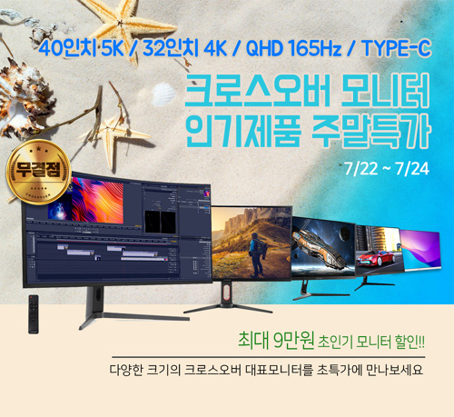 이번 행사동안 크로스오버의 빅포터블, 24, 27, 32형 등 다양한 모니터들이 저렴하게 판매된다. 행사기간은 7월 22일 금요일부터 24일 일요일까지 진행되며 아래 링크를 통해 크로스오버의 다양한 제품들을 저렴한 가격에 만나볼 수 있다. 포토상품평 이벤트도 진행돼 간단하게 상품평을 작성하고 상품권도 받을 수 있다.