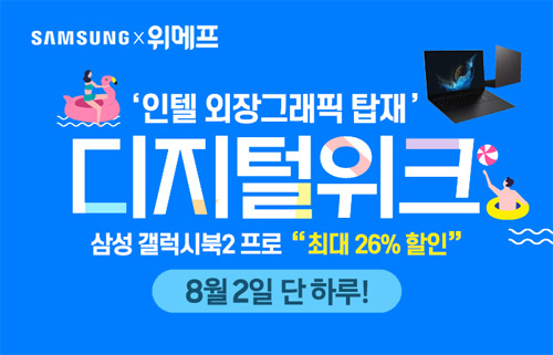 유니씨앤씨는 최신 인텔 12세대 CPU와 인텔 아크 그래픽 탑재, 초슬림 초경량 디자인으로 뛰어난 휴대성을 자랑하는 삼성 갤럭시북2 프로 NT950XEV-G51A 모델을 대상으로 최대 45만원 중복 할인과 푸짐한 사은품이 증정되는 ‘디지털위크’ 프로모션을 2022년 8월 2일 단 하루 위메프를 통하여 단독 진행한다.