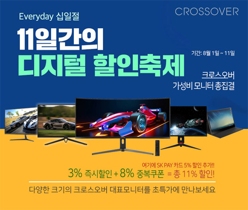 크로스오버는 자사의 인기 게이밍 및 고해상도 모니터 83종을 대상으로 11번가 8월 에브리데이 십일절 이벤트를 진행한다고 밝혔다.
