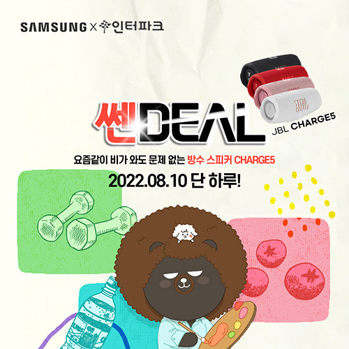 유니씨앤씨는 IP67 방진 방수 기능으로 침수 걱정 없이 사용이 가능한 블루투스 스피커 JBL CHARGE5 를 대상으로 할인 혜택이 제공되는 ‘쎈딜’ 프로모션을 인터파크를 통해 2022년 8월 10일 하루 동안 진행한다.