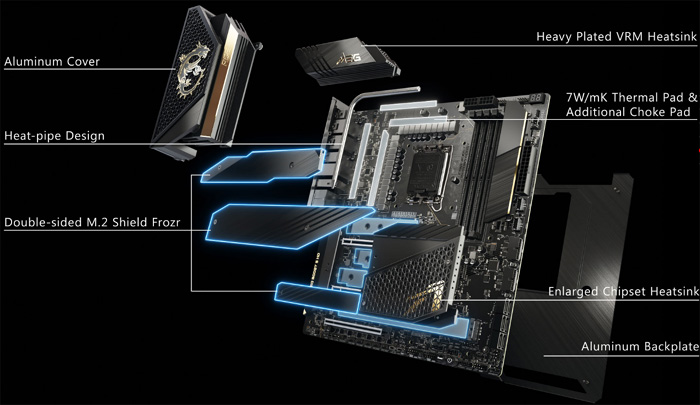 MSI Z690 에이스는 극한의 오버클럭이 적합한 최고급형 Z690 메인보드로 8레이어 PCB 설계로 더 높은 대역폭과 빠른 전송속도를 즐길 수 있으며 데이터 안정성을 높여 신뢰할 수 있는 신호 전송이 가능하다. 특히 오버클럭에서 중요한 전원부의 경우 총 19+1+2 디지털 파워 디자인을 적용해 최상의 성능을 보장하며 높은 안정성을 경험할 수 있다. 여기에 전원부는 히트싱크가 적용되어 열을 제어하며 높은 온도로 작동하는 PCIe 4.0 SSD의 열을 빠르게 식혀주기 위해 쉴드 프로져가 설치되어 있다.