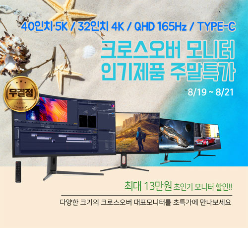 이번 행사동안 크로스오버의 빅포터블, 24, 27, 32형 등 다양한 모니터들이 저렴하게 판매된다. 행사기간은 8월 19일 금요일부터 21일 일요일까지 진행되며 아래 링크를 통해 크로스오버의 다양한 제품들을 저렴한 가격에 만나볼 수 있다. 포토상품평 이벤트도 진행돼 간단하게 상품평을 작성하고 상품권도 받을 수 있다.